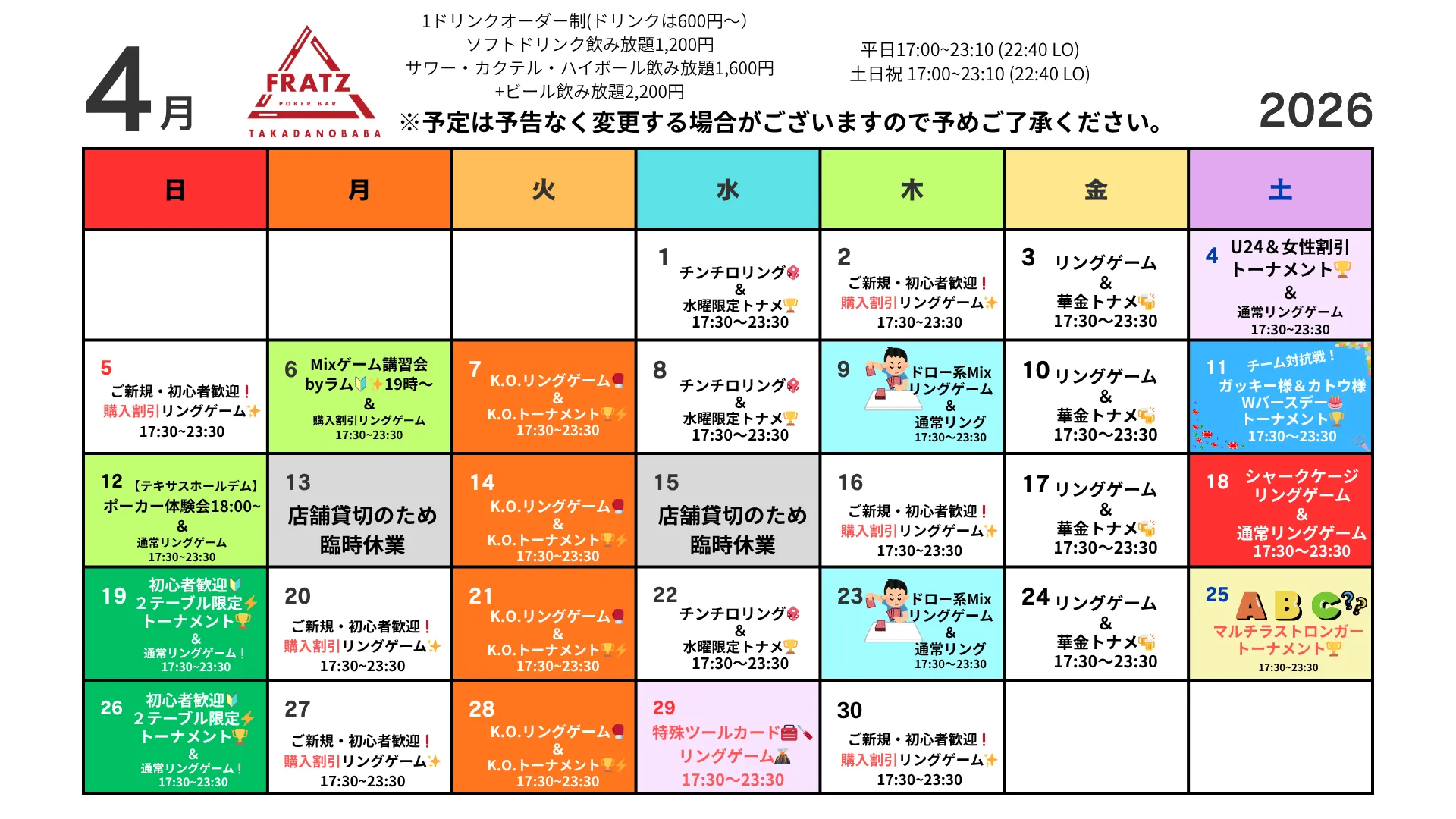 Fratz高田馬場店4月の予定一覧